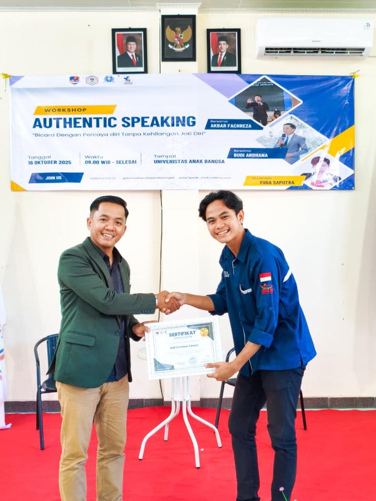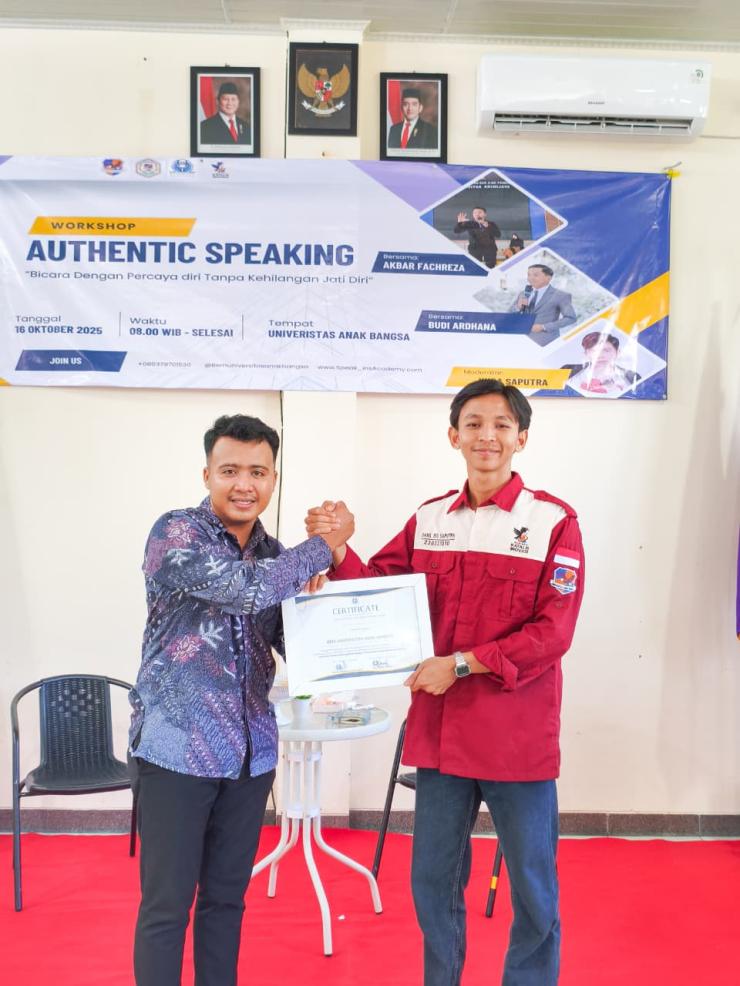 Authentic Speaking: Bicara dengan Percaya Diri Tanpa Kehilangan Jati Diri Sebuah seminar inspiratif yang diinisiasi oleh BEM Universitas Anak Bangsa berkolaborasi dengan Speak In Academy. Kegiatan ini menghadirkan pengalaman belajar tentang bagaimana berbicara dengan percaya diri, tanpa harus meninggalkan keaslian diri (Kamis, 16 Oktober 2025).