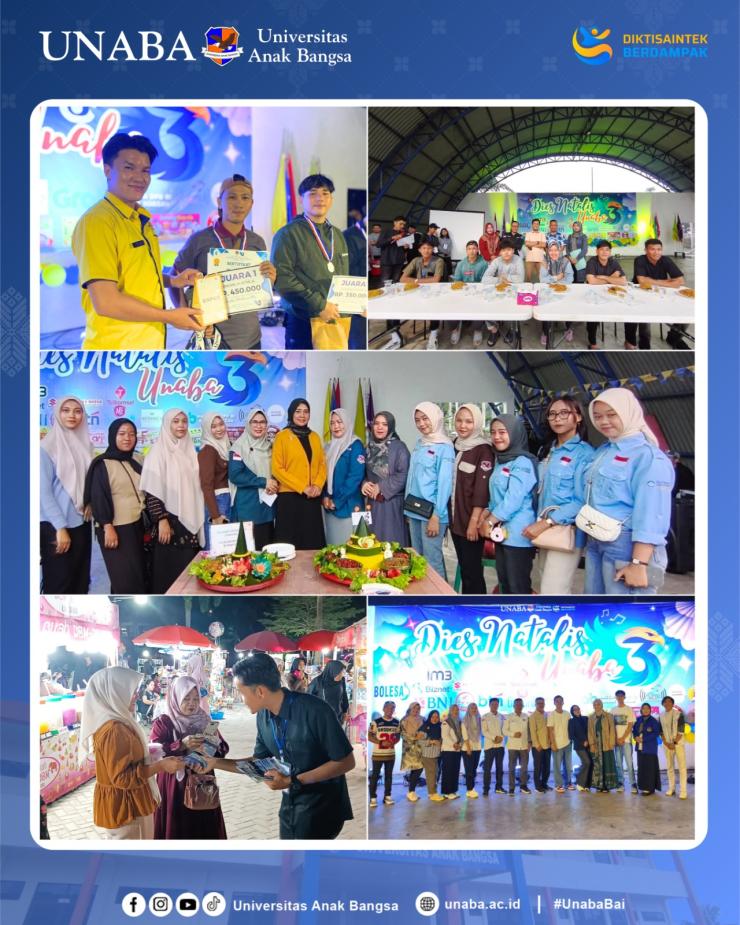 Universitas Anak Bangsa (UNABA) memperingati Dies Natalis sebagai momentum refleksi dan syukur atas perjalanan, capaian, serta kontribusi UNABA dalam dunia pendidikan tinggi. Peringatan ini menjadi ajang untuk mempererat kebersamaan seluruh civitas akademika sekaligus meneguhkan komitmen UNABA dalam meningkatkan mutu pendidikan, penelitian, dan pengabdian kepada masyarakat.